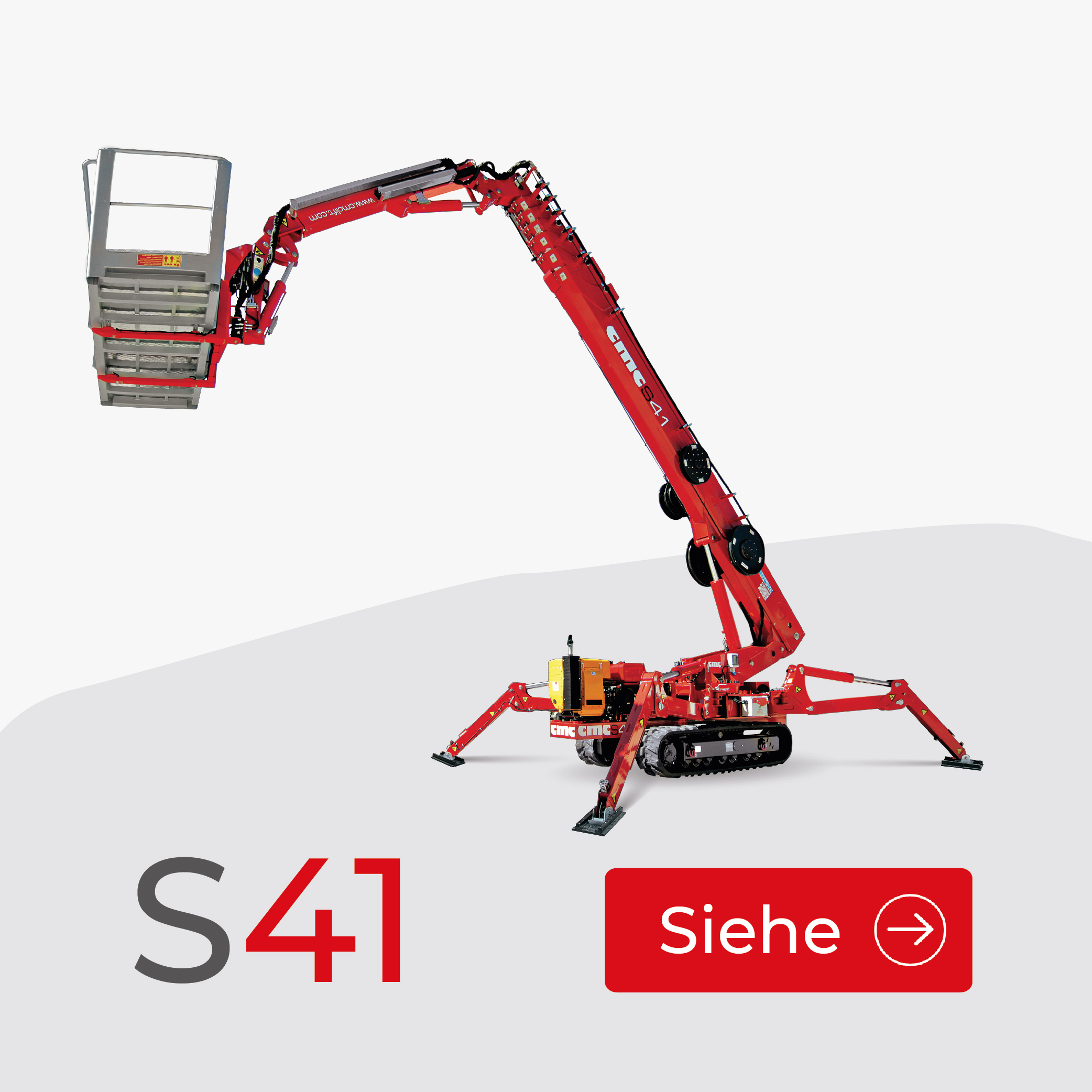Trotz seiner außergewöhnlichen Höhe kann er mit einer minimalen Abstützfläche von 3,99m stabilisiert werden und nimmt beim Transport nur sehr wenig Platz ein. CMC S41 ist ein außergewöhnliches Arbeitsgerät, das den anspruchsvollen Aufgaben immer gewachsen ist.